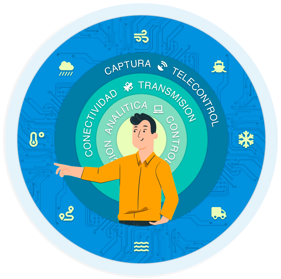 Nuestra solución combina terminales resistentes IP67 de bajo consumo energético con conectividad bidireccional y transmisión dual (satelital y GPRS). Integra dataloggers de marcas líderes como Campbell Scientific y OTT Hydromet, además de extender la cobertura a puntos cercanos mediante redes mesh. También diseñamos y fabricamos electrónica complementaria, garantizando un sistema robusto y adaptable a diversas necesidades.
